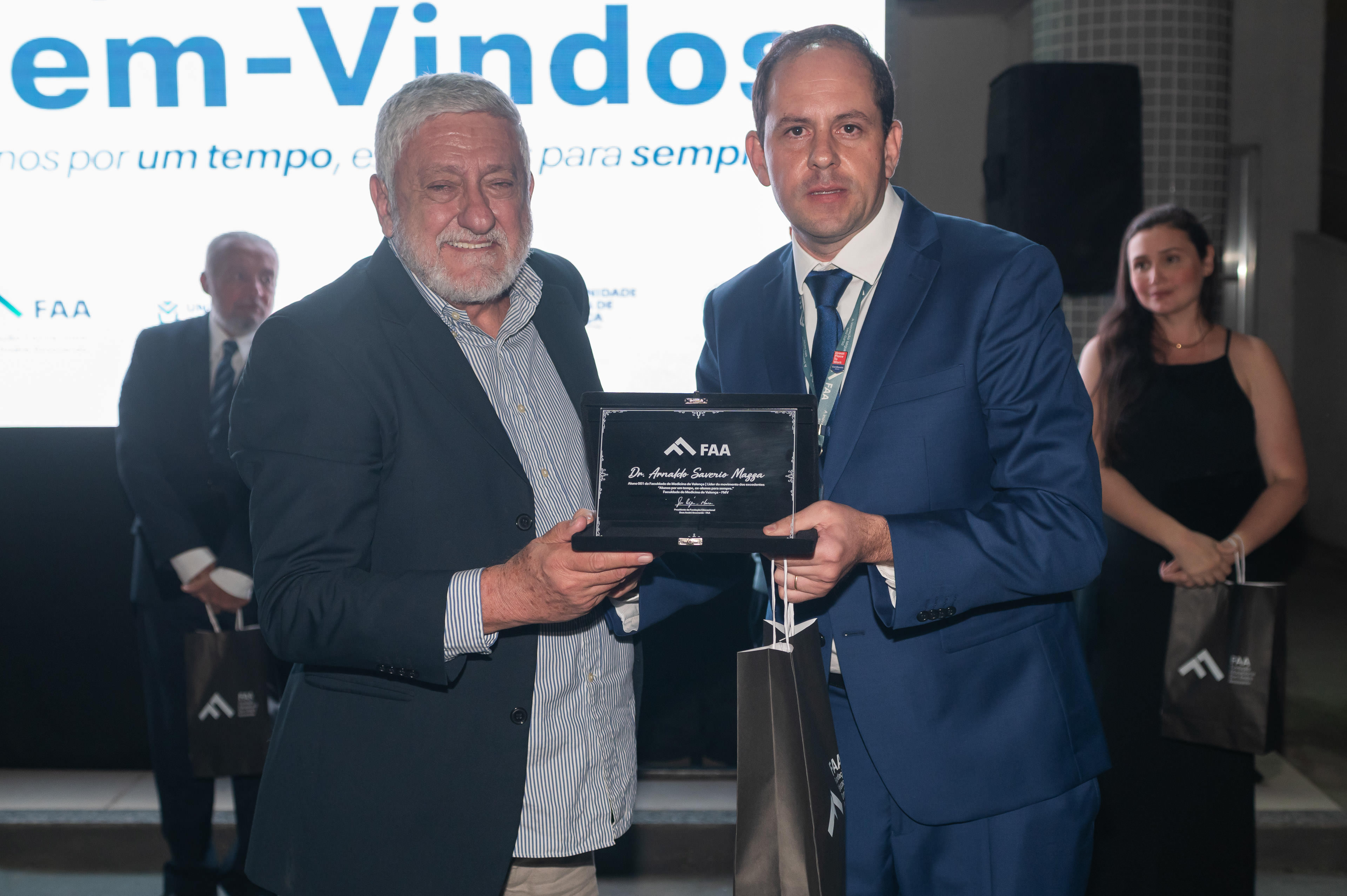 Durante a justa homenagem, o Presidente da FAA, José Rogério Neto, foi enfático ao justificar aquele momento: “Estamos resgatando a gratidão!”. Agora, a imagem de Mazza está para sempre no Campus Saúde do UNIFAA, servindo de inspiração para todos que passam pela instituição. “Desde o nascimento, o homem tem um enigma: fugir ou lutar. Ou enfrenta e luta, e aí arca com essa demanda, ou foge, que é o mais fácil de fazer”, conta Mazza, que optou por lutar. E o tempo, tendo o esforço e a dedicação de diferentes gerações como cúmplices, vem testemunhando uma linda saga em Valença (RJ). Servindo de brisa para envolver as palavras de Arnaldo Mazza, foi realizada uma entrevista na qual ele comenta desde a alegria de ser homenageado, passando pelo cenário de criação da antiga FMV e fazendo questão de deixar uma mensagem aos colegas de profissão.